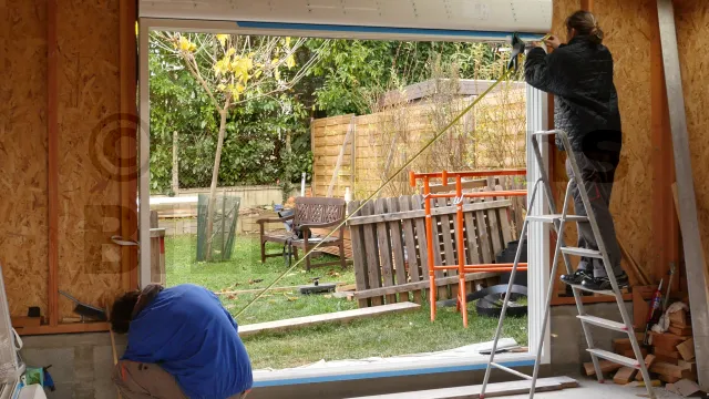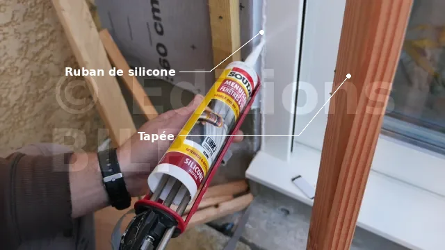 La finition consiste à dissimuler les colmatages en silicone entre les murs et la baie en mettant en place des baguettes en bois (tapées).