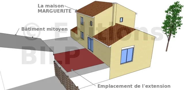 L’extension est placée sur la façade principale de la maison pour éviter la création d’une ouverture. Elle doit communiquer avec le bâtiment existant, et est donc placée au droit de la porte d’entrée.