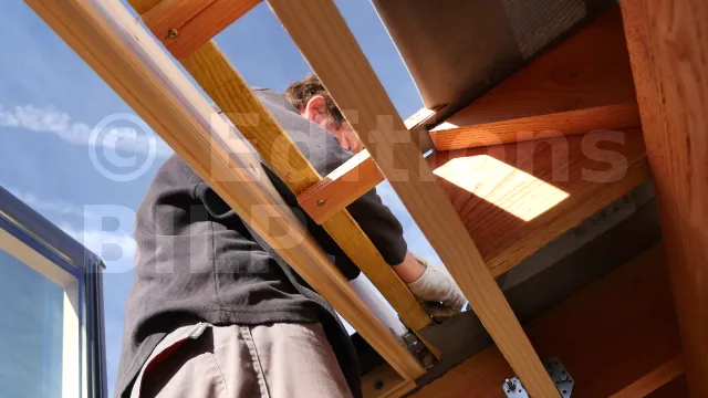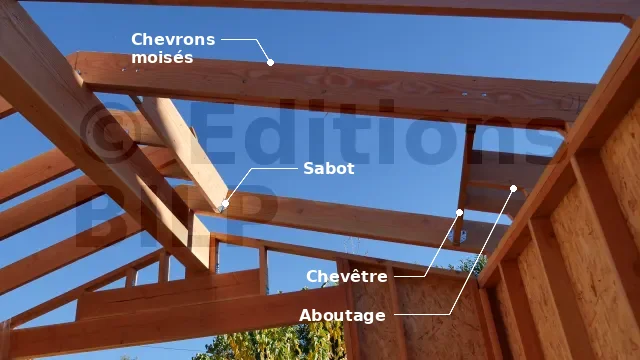 Les aboutages sont fixés au chevêtre à l’aide de vis. Les chevêtres sont soutenus par des chevrons moisés grâce à des sabots. Les chevrons sont moisés pour renforcer la solidité. En effet, les aboutages s’appuient sur les chevêtres, qui à leur tour s’appuient sur les chevrons. Ces deux chevrons supportent donc toutes les charges sur cette zone, ce qui explique leur moisement.