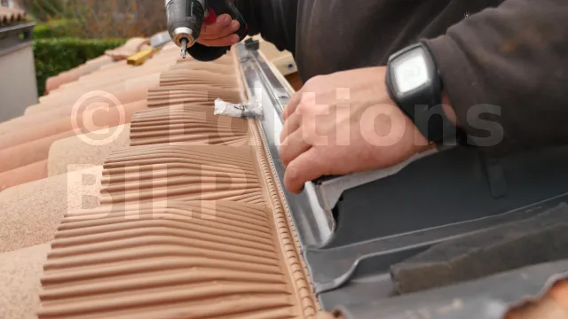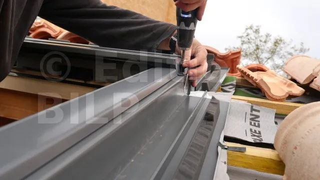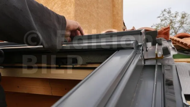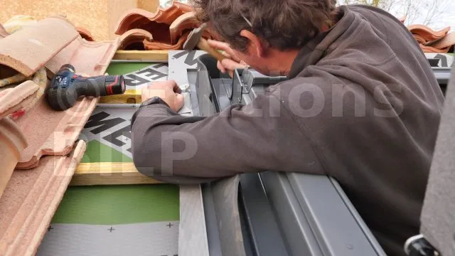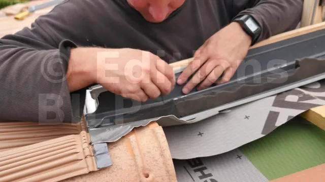 Le solin situé sur la partie inférieure de la fenêtre fait partie des quatre raccords d’étanchéité et est fixé au bâti de la fenêtre. Il est essentiel de bien maroufler le solin pour qu’il adhère correctement aux tuiles.