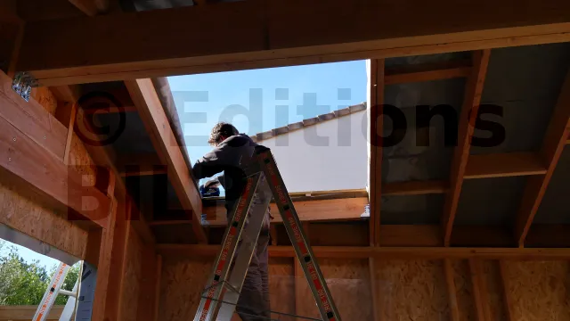 Les écrans pare-pluie repliés sont fixés sur le bâti à l’aide de bandes adhésives étanches.