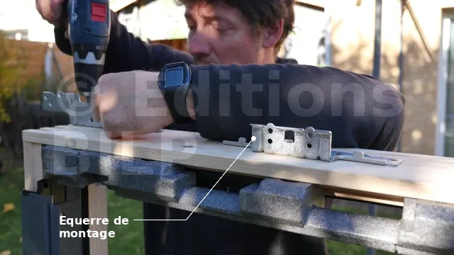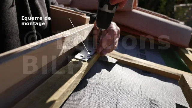Placez le bâti sur les tasseaux, puis fixez temporairement les équerres de montage sur ces derniers en les vissant sans les serrer complètement, afin de permettre d’éventuels ajustements ultérieurs.
